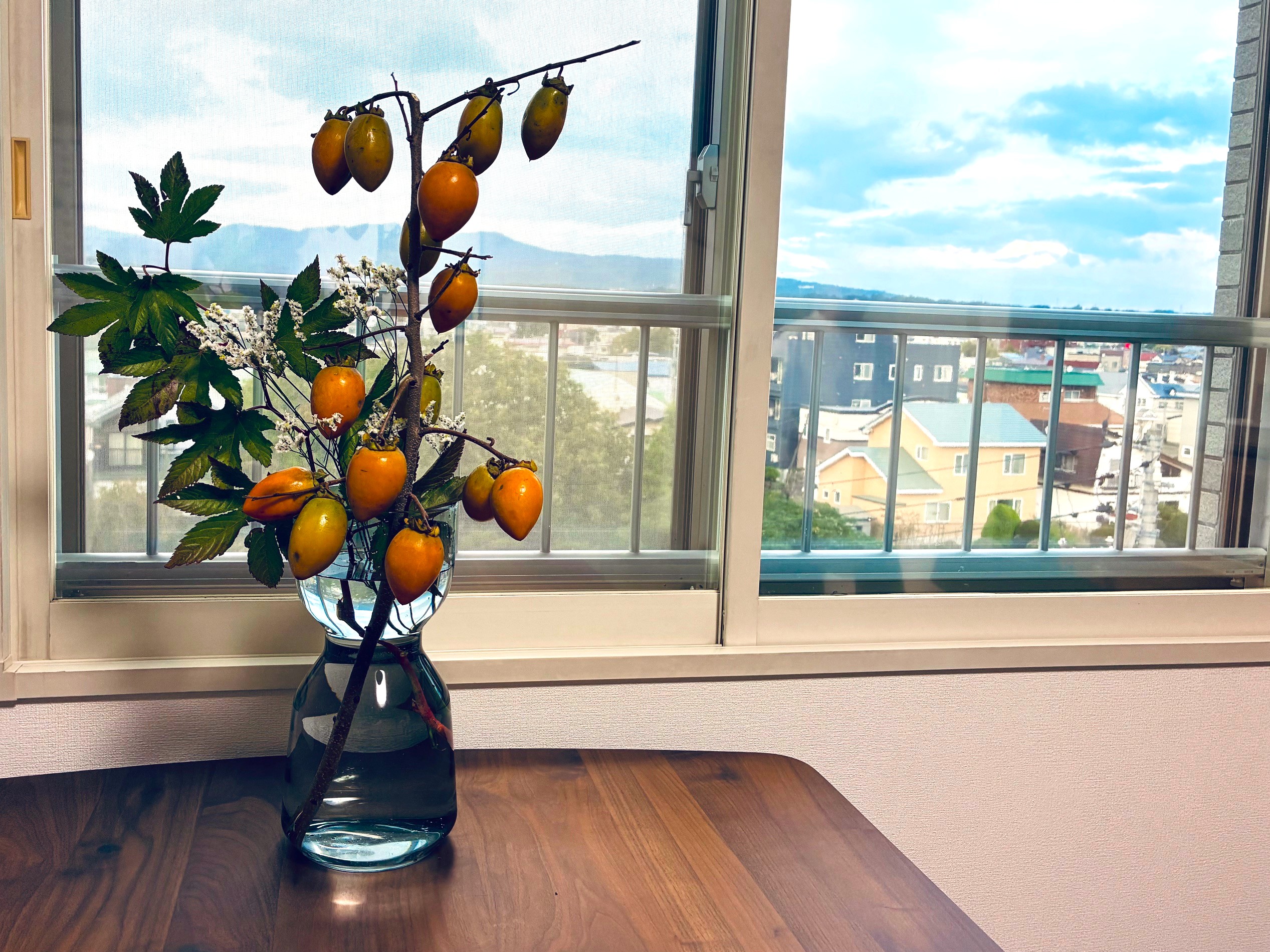 いつもここに 花と緑 №10 2025 10/01 お知らせ 2025年10月1日 窓の向こうには山並みテーブルの上には花と緑を欠かさずに2025年10月の窓辺には柿と木苺の葉にスターチス秋のみのりを眺めつつ今日も仕事に励んでいます お知らせ いつもここに 花と緑 №9